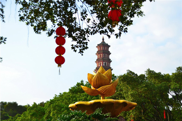 莲花山观音圣境,规模宏大,庄严雄伟。望海观音金像高40.88米,霞披狮海,光泽南天,是目前箔金铜像的世界之最。大型仿古建筑观音阁,建筑面积 4000多平方米,内设檀香木雕成的12米高千手千眼观音一座和其它形神各异的大小观音1000座,是名副其实的观音文化宝库。