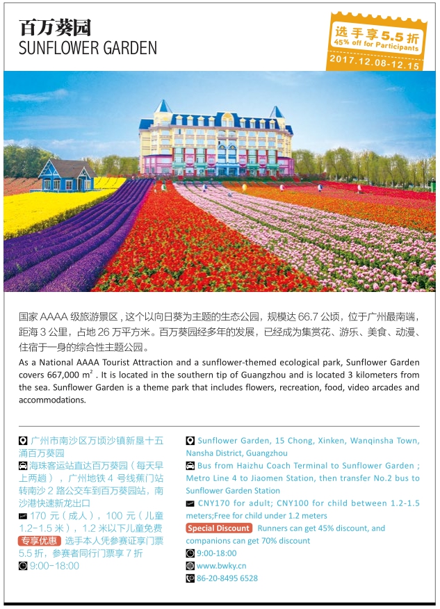 一座花开四季的城市,一场活力燃情的马拉松,一次幸福满满的畅游之旅。为了让来自全国和全世界的跑者在参加一场马拉松盛会的同时,更好地感受广州城市魅力,广马组委会为选手推出“畅游广州专享礼遇”旅游大礼包,《2017广马选手马拉松旅行纪念册》将连同竞赛物品一起向选手发放,广马选手持其中赠送的“2017广马选手畅游广州专享礼遇卡”与身份证、报名确认函即可享受景区、旅行社、酒店等方面多重优惠。