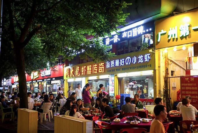 In Guangzhou finden viele St?tten vor, wo man leckeres zum Mitternachtessen genie?en kann, wie z.B. Imbissst?nden in Wendestra?e, Food Street in Panyu Bezirk und vor allem Baoyestra?e in Haizhu Bezirk, die beliebtest und besonders empfehlenswert ist. Nach 11 Uhr wird die Stra?e mit lebhaftem Betrieb hell beleuchtet. Die üblichsten Gerichte hier sind kantonesisch, vor allem angebratene Spezialit?ten, Meeresfrüchte und im Tontopf gekochter Reisbrei, daneben auch einE Vielfalt von gebratenen Kebabs.